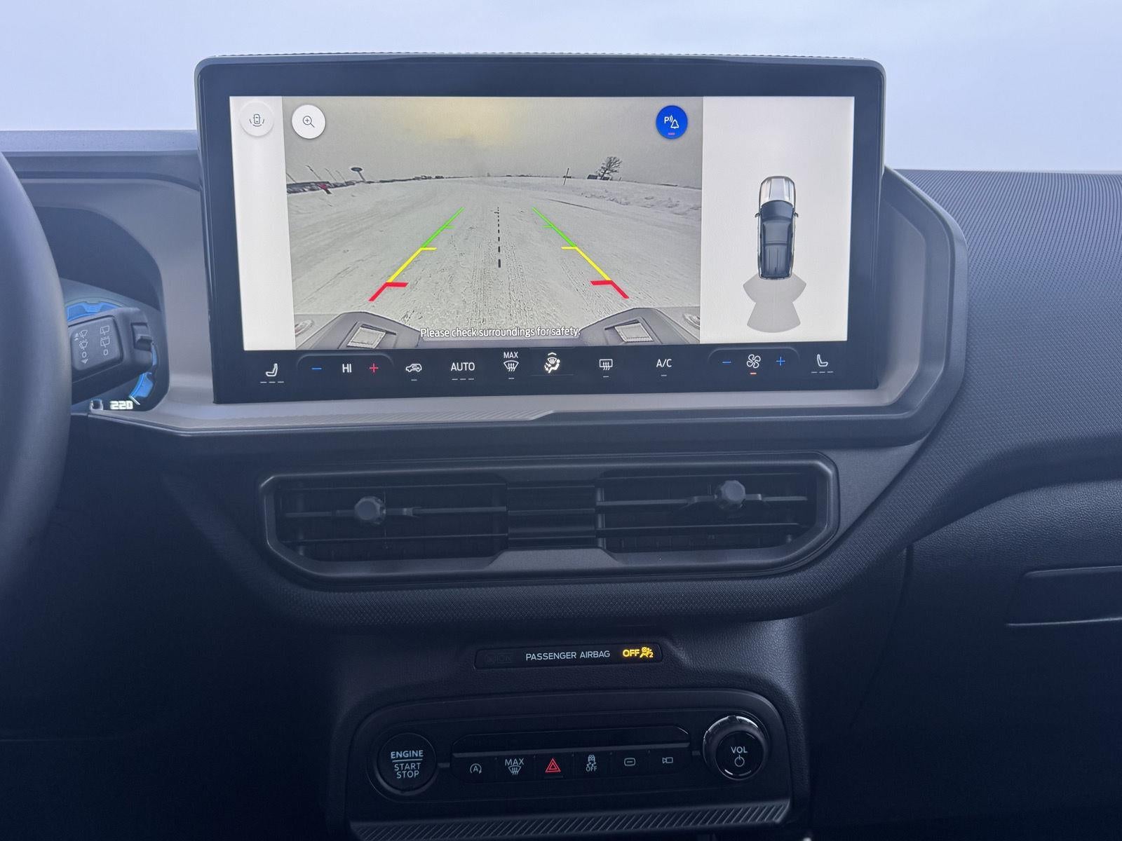 - The vehicle is equipped with a camera that displays an image of the area behind the vehicle on an interior display.