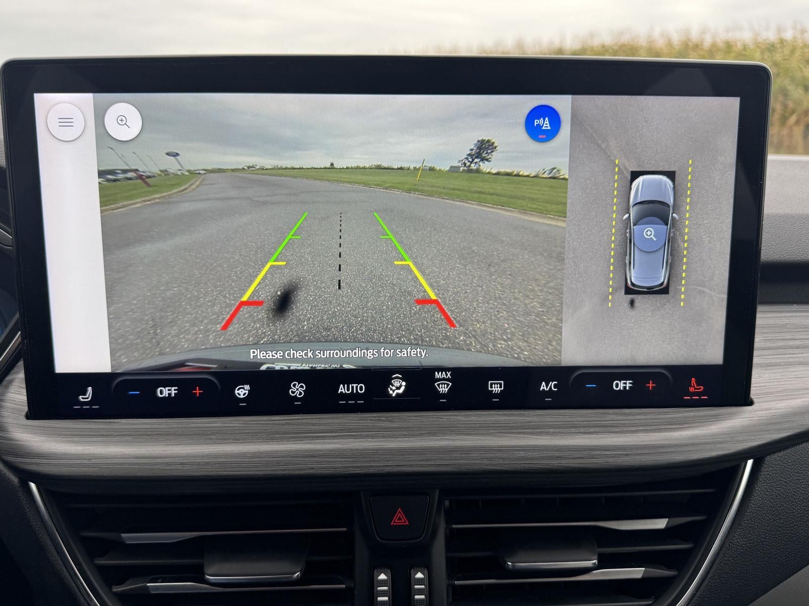 - The vehicle is equipped with a camera that displays an image of the area behind the vehicle on an interior display.