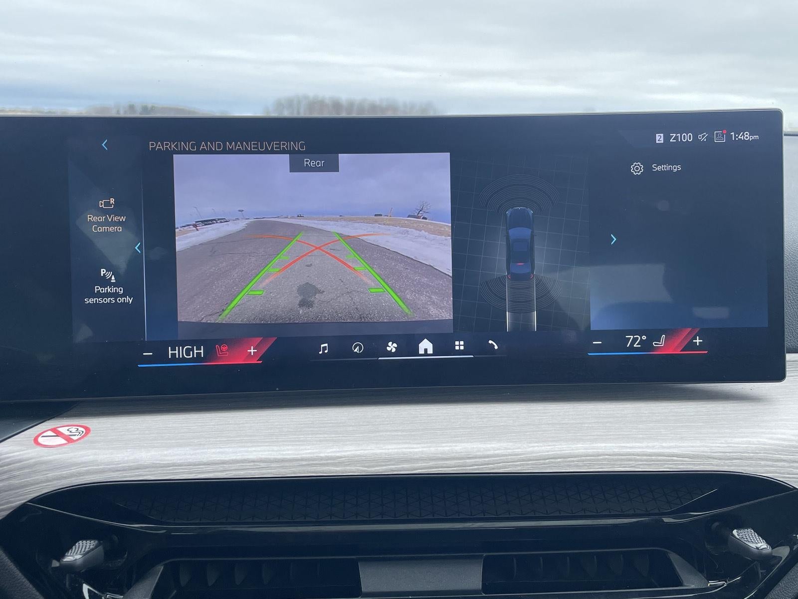- The vehicle is equipped with a camera that displays an image of the area behind the vehicle on an interior display.
